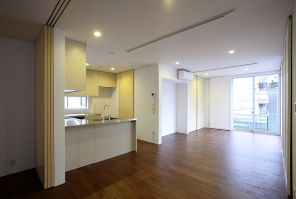 1Fは親世帯でリビング・ダイニングに面して寝室が二つありますが、これらはそれぞれ引き込みの引き戸で区切られており、すべて開け放てば大きなワンルームとなるようになっています。リビングは、東と南に窓があり熱負荷が大きいこと、東側の大きな道路に面しているので内部が丸見えになってしまうこと、騒音が気になることから雨戸の代わりに部屋内に断熱材を面材にした建具(断熱戸)を取り付け、これを閉めれば開口部がすべて壁状となって視線を遮るとともに、断熱戸で安定した温熱環境を獲得しています。また、この材料は吸音もするので、副次的効果ではありましたが、外部騒音も軽減されてとても静かな室内環境を作り出すことにも成功しています。